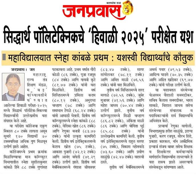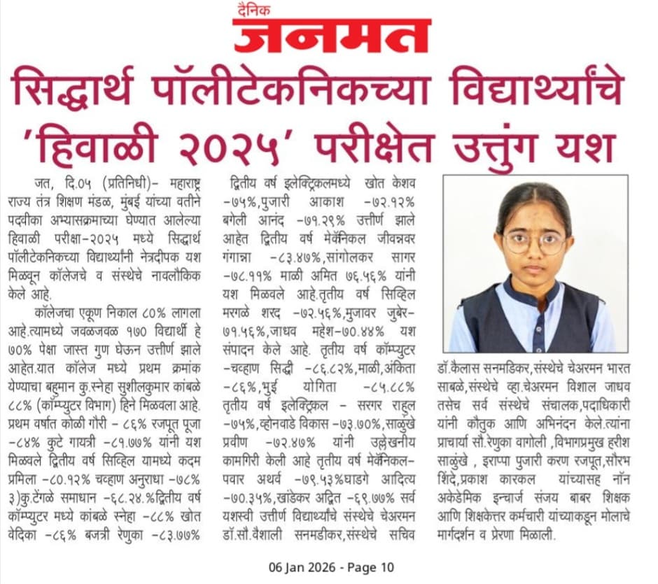 सिद्धार्थ पॉलीटेकनिकच्या विद्यार्थ्यांचे हिवाळी 2025 च्या परीक्षेत उत्तुंग यश