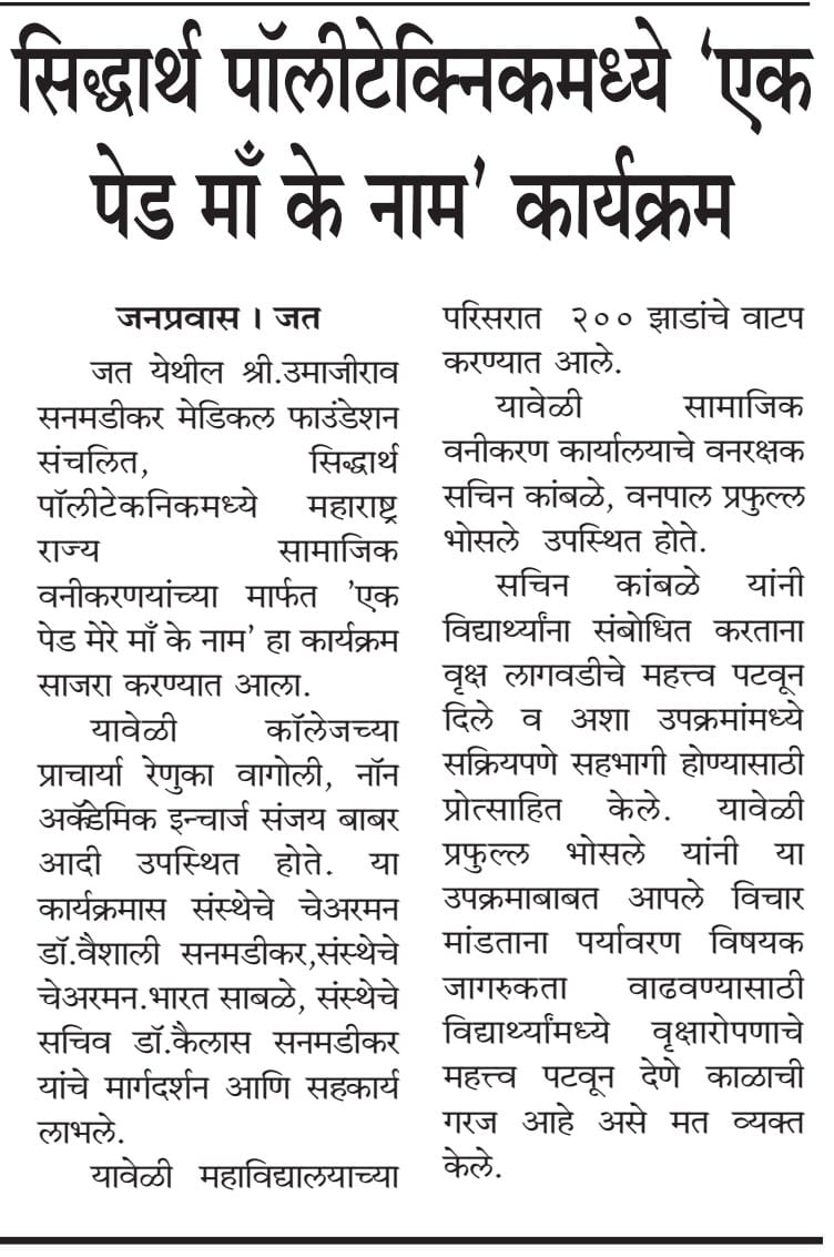 Posted : 2024-08-22*सिद्धार्थ पॉलीटेकनिक मध्ये 'एक पेड मेरे माँ के नाम' कार्यक्रम संपन्न.* श्री. उमाजीराव सनमडीकर मेडिकल फाउंडेशन जत संचलित, सिद्धार्थ पॉलीटेकनिक जत येते, महाराष्ट्र राज्य सामाजिक वनीकरण जत,यांच्या मार्फत 'एक पेड मेरे माँ के नाम' हा कार्यक्रम साजरा करण्यात आला. तुम्हाला मायेची ऊब हवी तर मग आईच्या नावे प्रत्येक भारतीयाने एक वृक्ष लावावा आणि त्याला जगवावे. कारण पर्यावरणाचा होणारा ऱ्हास रोखण्यासाठी केंद्र शासनाने १४० कोटी जनतेच्या खांद्यावर १४० कोटी वृक्ष लागवडीची जबाबदारी सोपवली आहे. ‘एक पेड मेरे माॅं के नाम’ ही संकल्पना राबविण्याचा निर्धार सोडला आहे. आईच्या नावाने लावलेले झाड भविष्यात मुलांना नक्कीच सुखाची सावली देईल, यात दुमत नाही.या उपक्रमाचा एक भाग म्हणून महाविद्यालयाच्या परिसरात 200 झाडांचे वाटप करण्यात आले. यावेळी सामाजिक वनीकरण कार्यालयाचे श्री.सचिन कांबळे (वनरक्षक),श्री.प्रफुल्ल भोसले (वनपाल) उपस्थित होते.सचिन कांबळे यांनी विद्यार्थ्यांना संबोधित करताना वृक्ष लागवडीचे महत्त्व पटवून दिले व अशा उपक्रमांमध्ये सक्रियपणे सहभागी होण्यासाठी प्रोत्साहित केले. तसेच,प्रफुल्ल भोसले यांनी या उपक्रमाबाबत आपले विचार मांडताना पर्यावरण विषयक जागरुकता वाढवण्यासाठी विद्यार्थ्यांमध्ये वृक्षारोपणाचे महत्त्व पटवून देणे काळाची गरज आहे असे मत व्यक्त केले. यावेळी कॉलेज च्या प्राचार्या सौ.रेणुका वागोली ,नॉन अकॅडेमिक इन्चार्ज श्री.संजय बाबर,सर्व विभाग प्रमुख,शिक्षक,शिक्षकेत्तर कर्मचारी,विद्यार्थी आणि विदयार्थीनी उपस्थित होते. या कार्यक्रमास संस्थेचे चेअरमन डॉ.वैशाली सनमडीकर,संस्थेचे चेअरमन श्री.भारत साबळे, संस्थेचे सचिव डॉ.कैलास सनमडीकर यांचे मोलाचे मार्गदर्शन आणि सहकार्य लाभले.