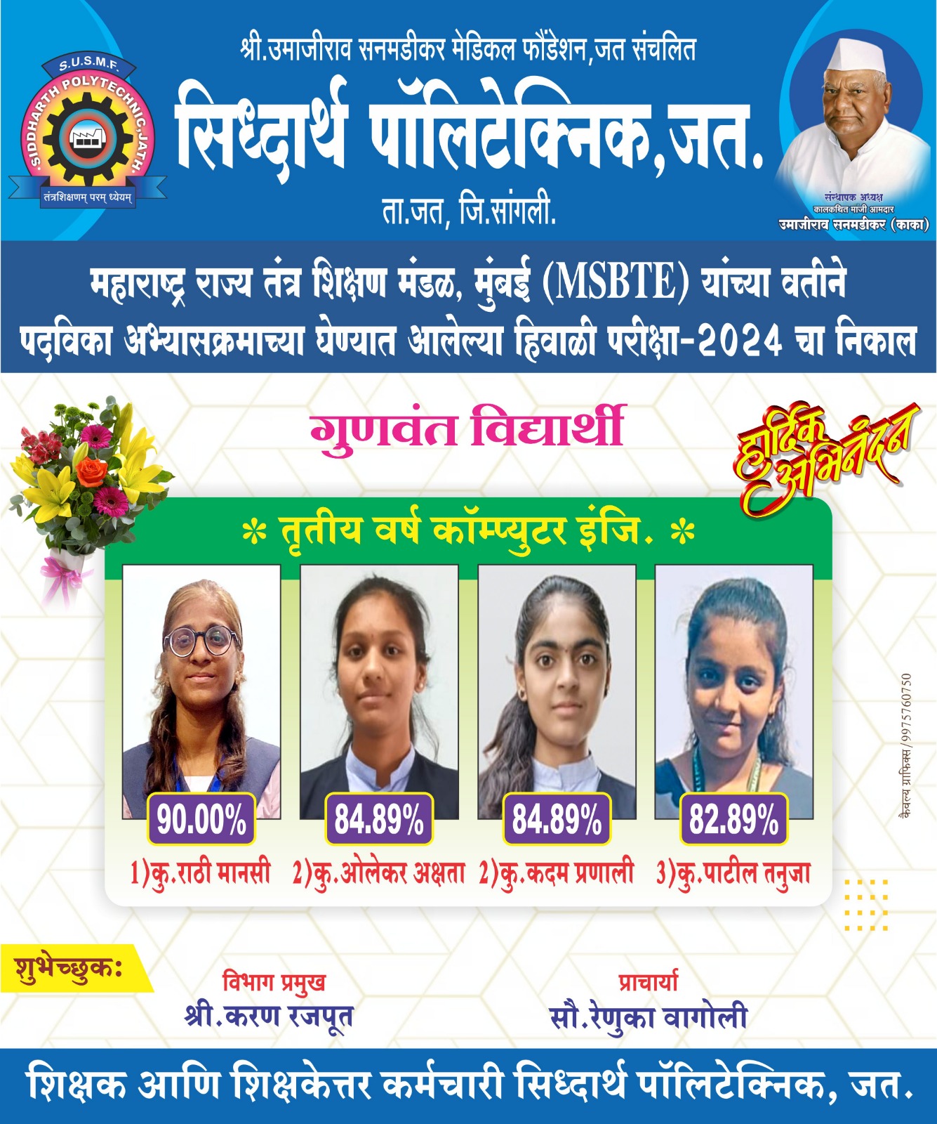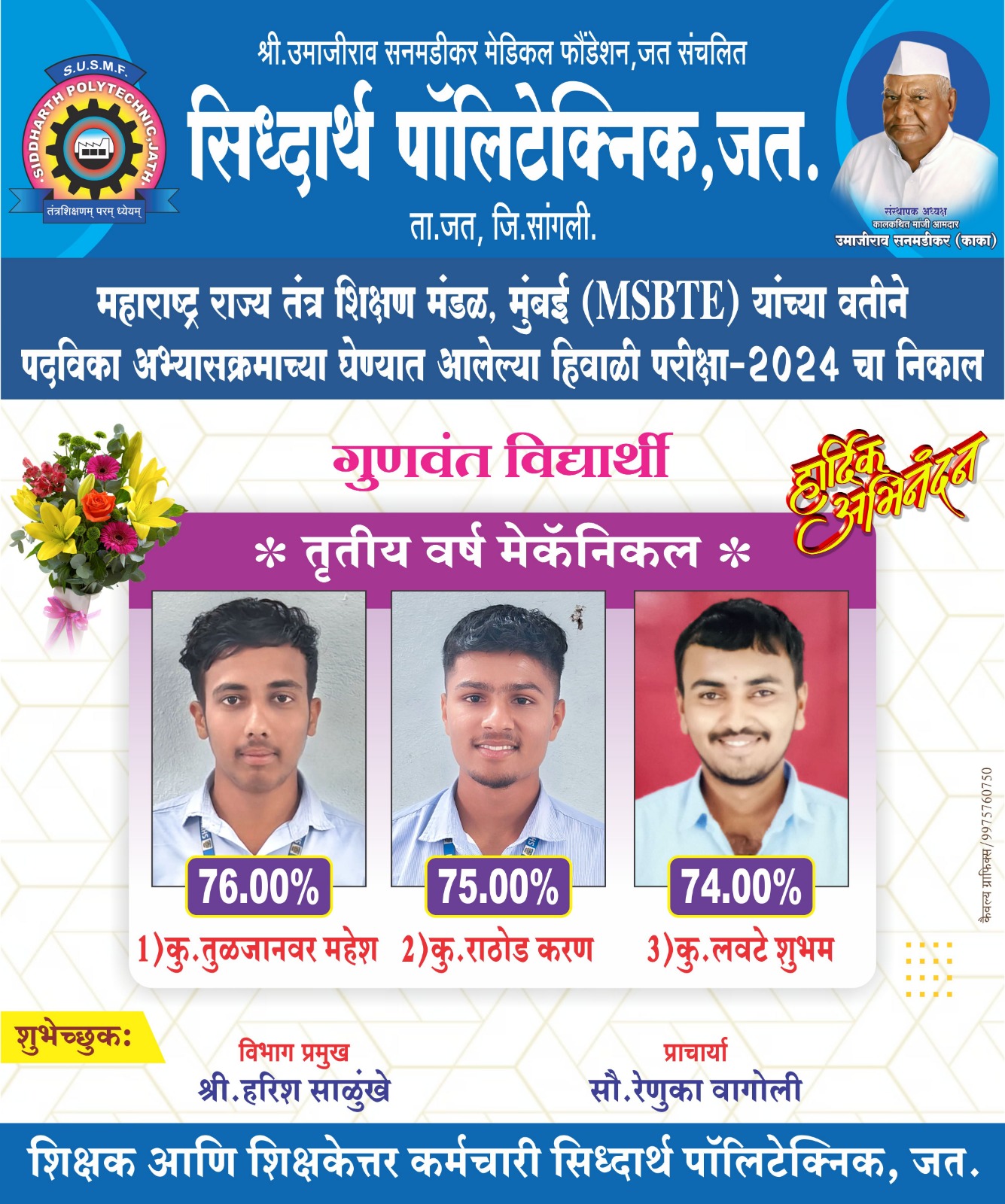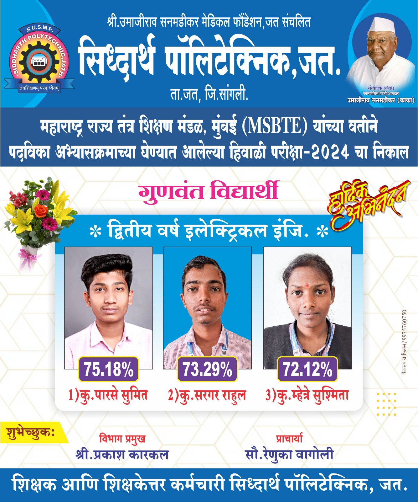 Posted : 2025-01-27सिद्धार्थ पॉलीटेकनिकच्या विद्यार्थ्यांचे हिवाळी 2024 च्या परीक्षेत उत्तुंग यश 💐 महाराष्ट्र राज्य तंत्र शिक्षण मंडळ, मुंबई (MSBTE) यांच्या वतीने पदवीका अभ्यासक्रमाच्या घेण्यात आलेल्या हिवाळी परीक्षा-2024 मध्ये सिद्धार्थ पॉलीटेकनिकच्या विद्यार्थ्यांचे नेत्रदीपक यश. कॉलेजचा एकूण निकाल 88% लागला आहे. यात कॉलेज मध्ये प्रथम क्रमांक येण्याचा बहुमान कु.राठी मानसी 90% (कॉम्प्युटर विभाग) हिने मिळवला आहे. विभागानुसार निकाल पुढीलप्रमाणे प्रथम वर्ष - 1) कु.खोत वेदिका - 80% 2)कु.शिंदे अजय -79% 3)कु.राठोड नेमाजी -78% द्वितीय वर्ष सिव्हिल * 1)कु.लोखंडे अरुण -80.71% 2)कु.मुडदेगोल सचिन-74.12% 3)कु.जाधव महेश -73.06% द्वितीय वर्ष कॉम्प्युटर 1)कु.चव्हाण सिद्धी -88.59% 2)कु.गुरव मानसी -86.94% 3)कु.भुई योगिता -83.29% द्वितीय वर्ष इलेक्ट्रिकल 1)कु.पारसे सुमित -75.18% 2)कु.सरगर राहुल -73.29% 3)कु.म्हेत्रे सुश्मिता -72.12% द्वितीय वर्ष मेकॅनिकल 1)कु.पवार अथर्व -80% 2)कु.घाटगे आदित्य -76% 3)कु. खांडेकर अद्वित-73% तृतीय वर्ष सिव्हिल 1)कु.जातगार रफिक -76% तृतीय वर्ष कॉम्प्युटर 1)कु.राठी मानसी -90% 2)कु.ओलेकर अक्षता-84.89% 2)कु.कदम प्रणाली-84.89% 3)कु.पाटील तनुजा-82.89% तृतीय वर्ष इलेक्ट्रिकल 1)कु.धूप मानतेश -83.90% 2)कु.कोळेकर राहुल-79.20% 3)कु.सावंत रखमाजी-76.70% तृतीय वर्ष मेकॅनिकल 1)कु.तुळजानवर महेश -76% 2)कु.राठोड करण -75% 3)कु.लवटे शुभम -72% सर्व यशस्वी व उत्तीर्ण विद्यार्थ्यांचे संस्थेचे चेअरमन डॉ.सौ.वैशाली सनमडीकर,संस्थेचे सचिव डॉ.कैलास सनमडिकर,संस्थेचे चेअरमन श्री.भारत साबळे, सर्व संस्थेचे संचालक,पदाधिकारी यांनी कौतुक केले. त्यांना प्राचार्या सौ.वागोली रेणुका ,विभागप्रमुख- श्री.कारकल प्रकाश,श्री.साळुंखे हरीश,श्री.रजपूत करण,कु.पुजारी रुपाली,यांच्यासह नॉन अकेडेमिक इन्चार्ज श्री.बाबर संजय,शिक्षक आणि शिक्षकेत्तर कर्मचारी यांच्याकडून मोलाचे मार्गदर्शन व प्रेरणा मिळाली.💐